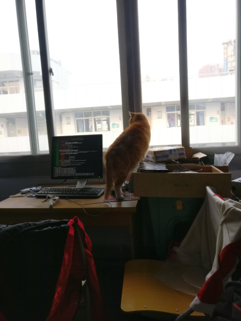 在办公室的日子是短暂的。OI 老师对它喜爱有加,另一个女老师却对随之而来的猫味忍无可忍。于是过了两周,我们只好将它放到隔壁还在建设中的黑机房——后来我们直接称之其为猫房。除去中间逃掉的几次,它在这一直住到了 2018 年的 3 月。