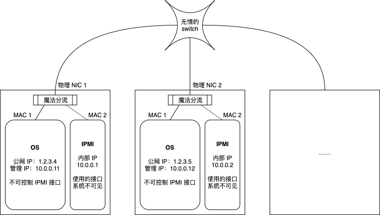 虽然一般而言,IPMI 在主板上会有一个独立的网口,但我接触过的独立服务器都支持共享网口模式,也就是指定一个主网口,通过某种魔法复用上面的单根网线——就好像在某个网口里塞了一个交换机,然后有一个模拟出来的 IPMI 网口。这个模拟网口独立运作,有单独的 MAC 地址,不受 OS 电源与主接口状态影响,在系统里也不可见。